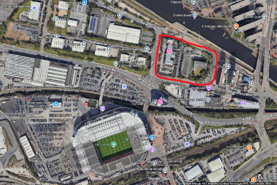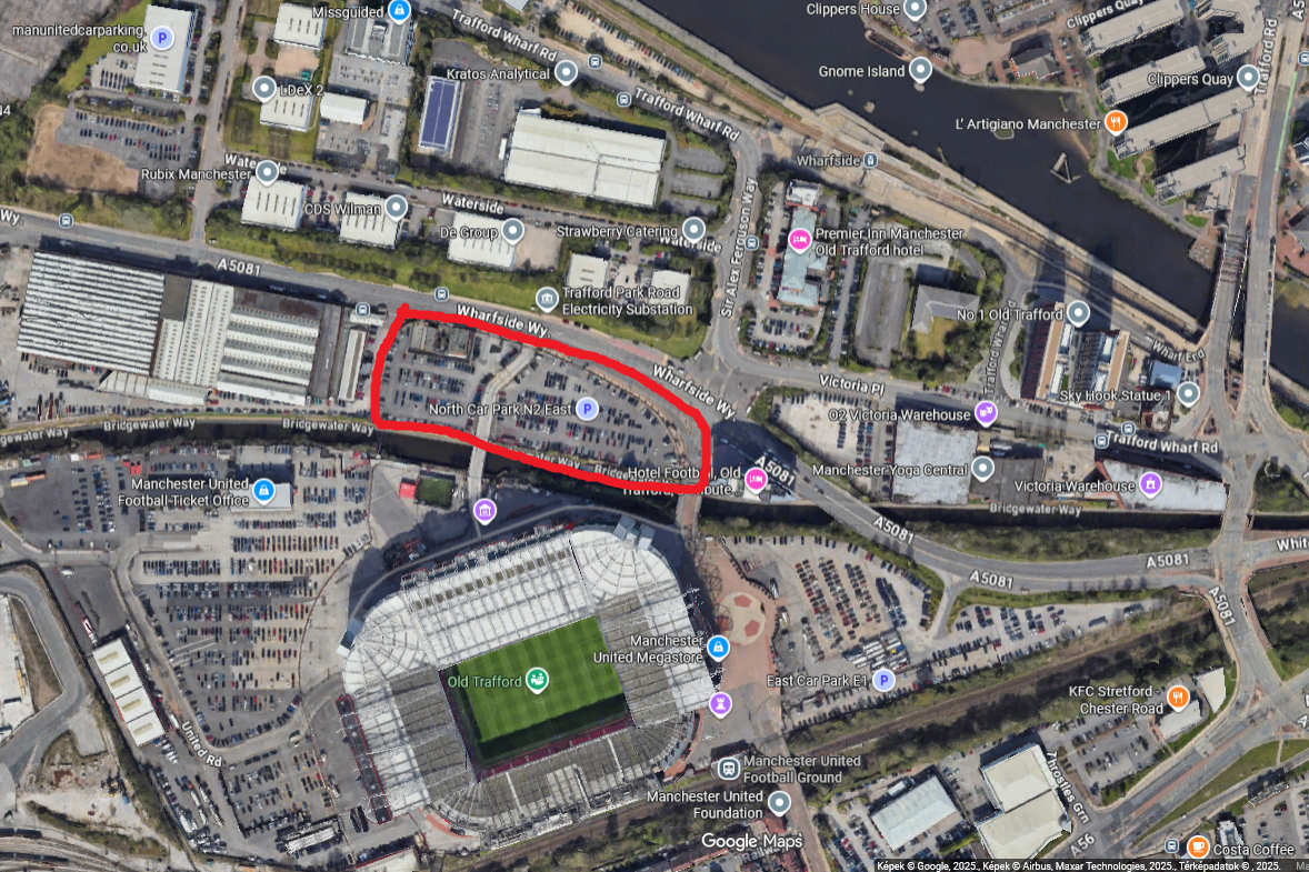 A képen a klub Wharfside, Trafford Park – terület. Megintcsak parkoló, másra nem nagyon jók ezek a telkek.