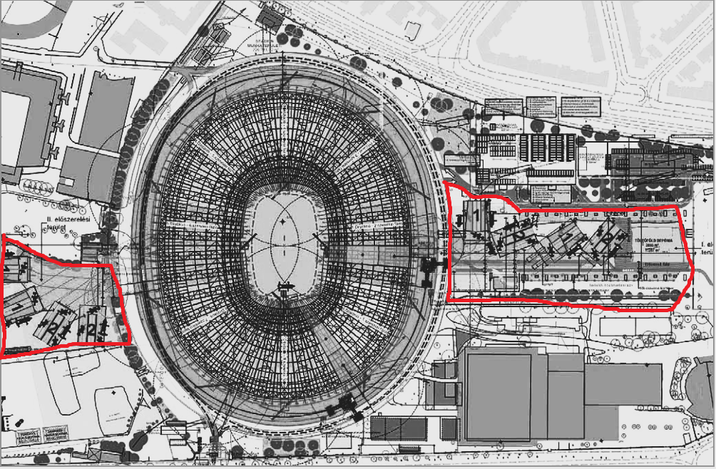 A képen a Puskás stadion organizációs terve a szerkezetépítés fázisában – pirossal kijelölve a két előszerelési terület. A Puskást kétoldalt építették szimultán, két előszerelő telepet is létesítettek, ami két hatalmas, 1250 tonnás teherbírású darut szolgált ki. Sajnos a baloldali nem látszik teljesen, kb az is akkora, mint a jobboldali
