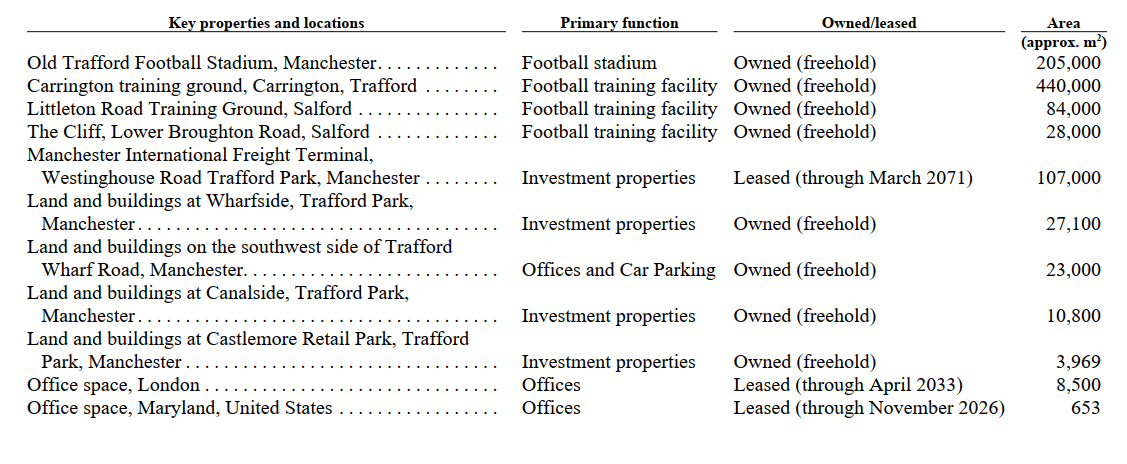 A londoni és az amerikai irodákat nem birtokoljuk, csak béreljük (valahol mégiscsak kell lennie pár Man Utd logóval ellátott üvegajtónak, ami mögé beülve néhány pogácsa mellett sir Jim és a Glazerék meg tudják győzni a bankárokat, hogy adjanak nekünk még több pénzt), a többi telket pedig bérbe adja a klub, túlnyomórészt parkolók üzemelnek ezeken, illetve van pár irodaház is – ezekből is befolyik néhány fillér a klub malacperselyébe évente.