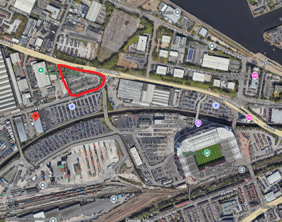 A képen a klub Wharfside, Trafford Park – terület. Megintcsak parkoló, másra nem nagyon jók ezek a telkek.
